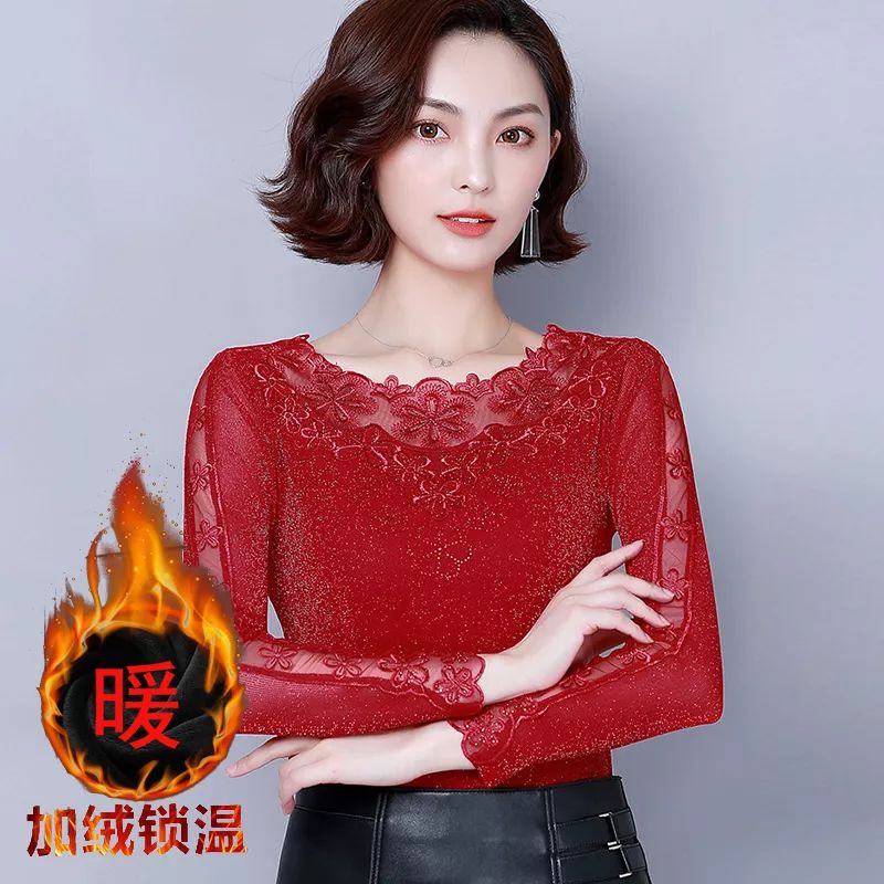 时尚百搭镶钻蕾丝上衣加绒T恤打底衫FMD1136