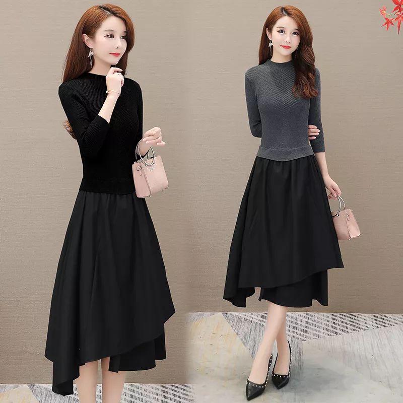 假两件针织拼接连衣裙新款修身高腰a字裙YD986