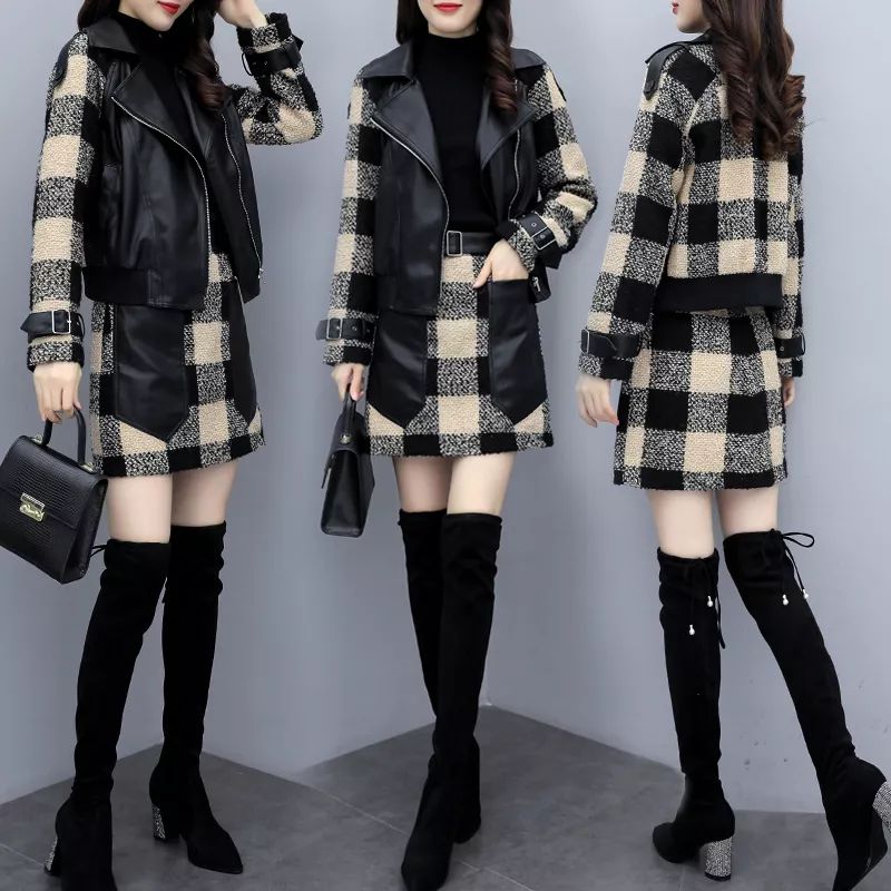 新款毛呢拼接外套格子短裙休闲时尚套装YD1004