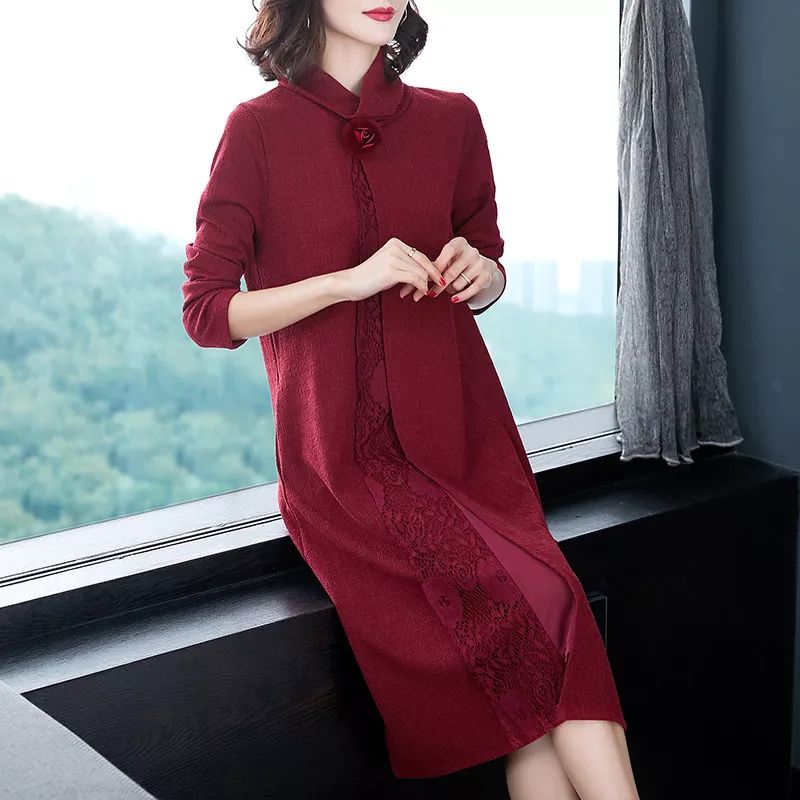 秋冬新款蕾丝拼接连衣裙中长款过膝MMZ6518
