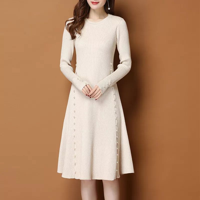 法式连衣裙宽松钉珠圆领长袖针织过膝裙NNJ005