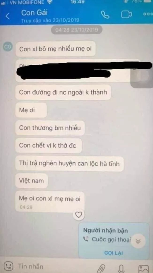 越南人權組織「Human Rights Space」25日表示,26歲的Tra My曾向家人發出連串道別訊息,內容提到:「對不起,媽媽。我的出國之路並不成功。媽媽,我太愛你了!我快死了,因為我不能呼吸……我來自越南河靜省……」該組織相信,Tra My當時正在出事的冷凍貨櫃向親友道別。