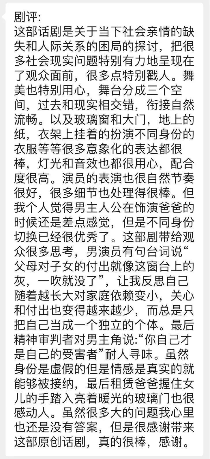 #共享家人##家庭陪伴# #空巢老人# #亲情交易# #家庭教育# #校园欺凌# #原生家庭# #爱与镣铐# #安乐死# ……这里有一心求死的空巢老人;有步履艰辛的单亲母亲;有孤立无援的校园暴力…一个个最真实却又最少被提及的家庭,一个个最艰难却又最少被关心的群体,以及,一个试图以出租自己的方式来寻求家人慰籍的孤儿。正是这些看似离奇,实则却真实存在社会每个角落的身份,串联起了话剧《家人待租》,