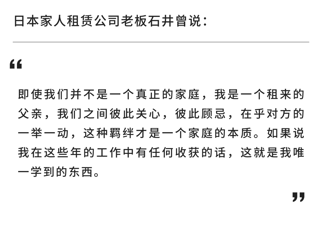 关于租赁家人,类似的新闻相信你一定听说过不少,日本近年兴起的“家庭租赁”公司,是一种很新奇的家政服务,出租你想要的家人给你,时间有长有短,有的合作时间甚至长达八年。那么像那些租了很长时间的家人,是否在情感上真的胜过了亲生家庭呢?