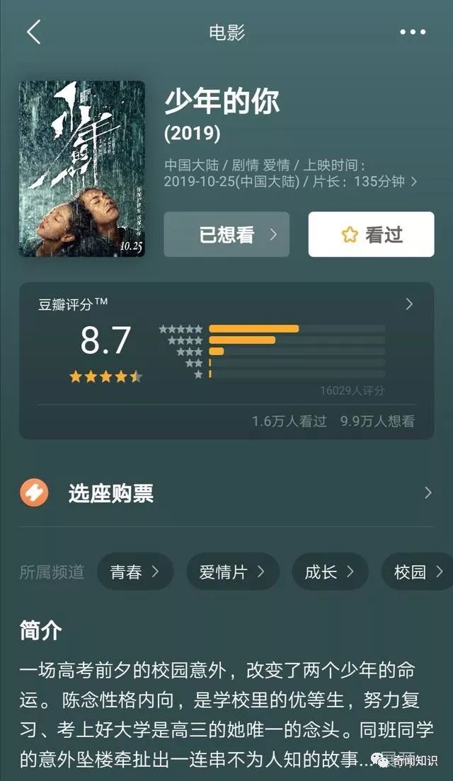 少年的你豆瓣评分出了,8.7,相当高了。不少人提到原著融梗,粉丝不要洗原著,可以把重点放在导演的再次创作上或者做好引导吧。因为这个点如果被对家团队引导大面积发酵是会影响影片的。