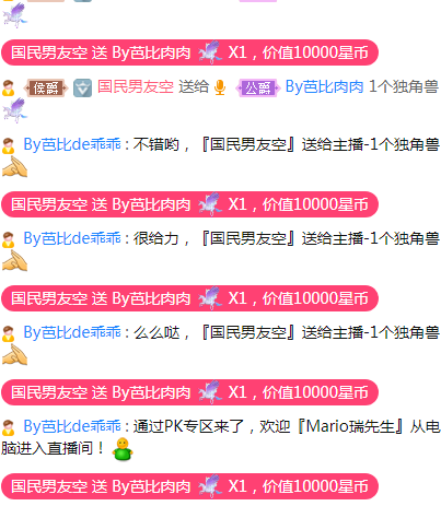因为前阵生病的原因所以我们新主播小祖宗和芭比还不是很熟悉,但是俩人也是不打不相识啊。小编尤记得这两个不同次元的小姐姐第一次PK就是“火药味”十足,没想到今天又是一个不小心就连上了麦。虽然停播一阵,但是小祖宗家里的回首哥芭比可是早有耳闻,一连上麦芭比就说,这次咱们还是才艺PK吧,上次也算是不打不相识了。这边话刚说完没一会,芭比家突然就开始上币了,这突如其来的礼物大家都有点懵,还没反应过来芭比家这位神秘男友哥就开始了独角兽连击模式。小祖宗这边一看这阵势,确定是一场才艺PK吗?回首哥也开启了血条争夺战,一场和平的才艺局就这么变成了一场大风暴。