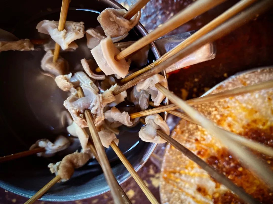 店里最显眼的是这口锈迹斑斑的大铁锅,里面放着涮肚串。