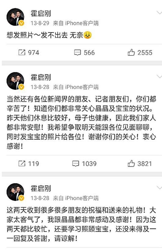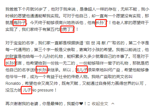 在九九八十一次否认怀孕之后,24日晚上,何猷君发微博宣布,称奚梦瑶为何家生下会“额外拥有一份财产”的“长孙”,真的真的(此处7个真的)辛苦了
