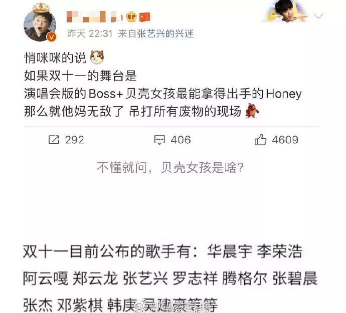 张艺兴大粉发博称如果张艺兴双十一舞台表演的是Boss和Honey,将吊打所有废物的现场。这场晚会公布的嘉宾有华晨宇、李荣浩、邓紫棋、张杰、罗志祥、张碧晨、韩庚、吴建豪等,这真的是张艺兴粉丝吗,太容易招黑了!!!