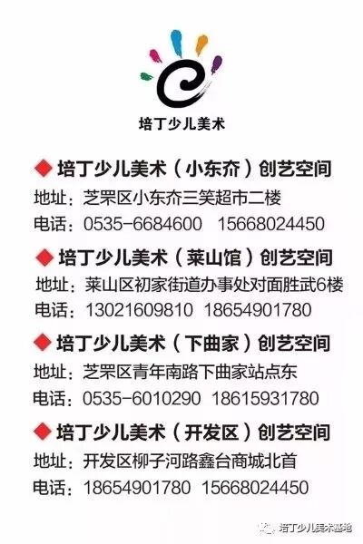 微信号:peidinghuihua1(←长按复制) 培丁少儿美术创办于2009年,专注现代少儿美术教育,致力于打造烟台特色专业少儿美术活动基地。在这里,孩子是创作的主体,在专业老师的引导下通过线条、色彩、创意、DIY制作等多种艺术形式,以独特的教学模式对孩子进行引导,开发孩子的潜能,让孩子在乐中学,在学中乐,从中体会到艺术的乐趣。既让孩子更好的掌握专业基础知识,提高绘画能力;又充分发挥个性,增强孩子自信,给孩子丰富的艺术体验,播种梦想,启迪智慧。课程热线:0535-6684600 6010290官方网站:www.peidingart.com
