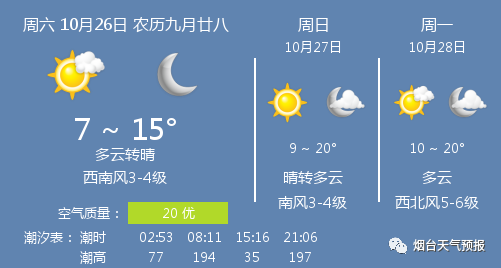 早上好,今天是10月26日,星期六,农历九月廿八。烟台天气:多云转晴,温度 7 ~ 15℃,西南风3-4级,日出时间 06:11,日落时间 17:05。实时:气温 10℃,北风3级,湿度 56%,气压 1015 hPa。