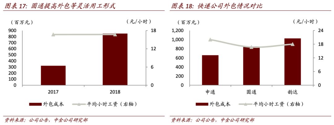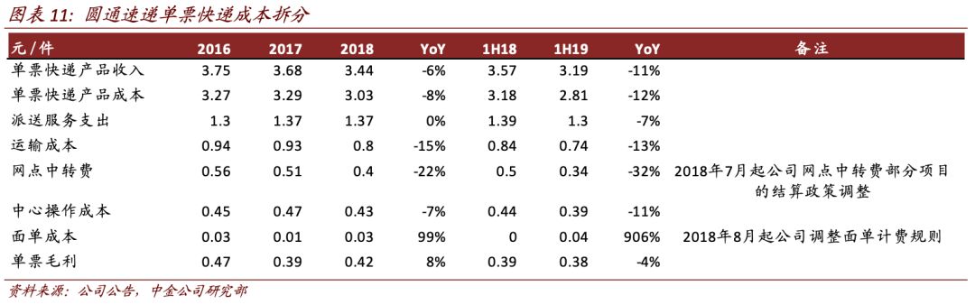 从2018年开始,圆通发力成本管控,取得了阶段性的成果,根据公司年报和半年报公布的口径,2018/1H19单票快递产品成本同比下降8%、12%,单票毛利同比上涨8%、下跌4%。
