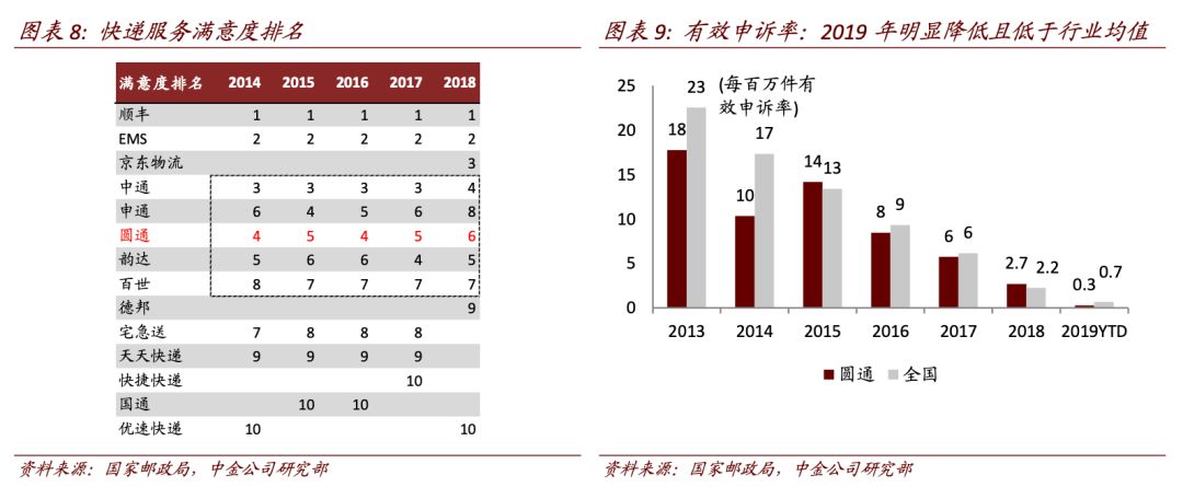 公司新任管理层将服务质量提高到全公司战略的高度,从总部层面和加盟商层面分别加大力度提升,已经取得效果,1H19公司有效申诉率下降92%,6、7、8月份申诉率在三通一达和百世五家公司中排名第 5/3/1名。