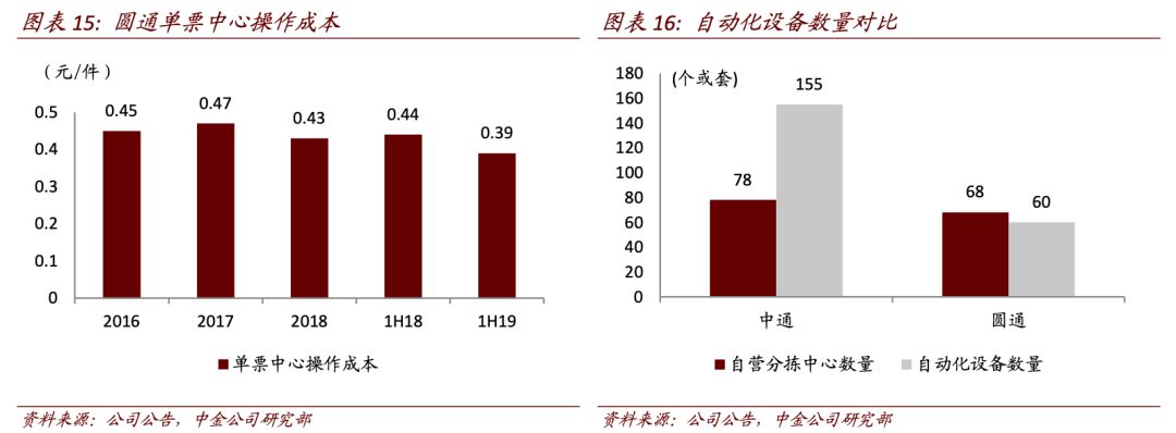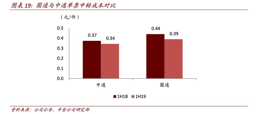 公司从2018年开始发力成本管控,2018/1H19单票快递产品成本同比下降8%、12%,主要通过降低干线运输成本和中心操作成本。考虑到圆通的成本基数依然较高,公司的各项举措需逐步产生效果,我们预期成本管控将持续发力,单票成本仍有下降空间。