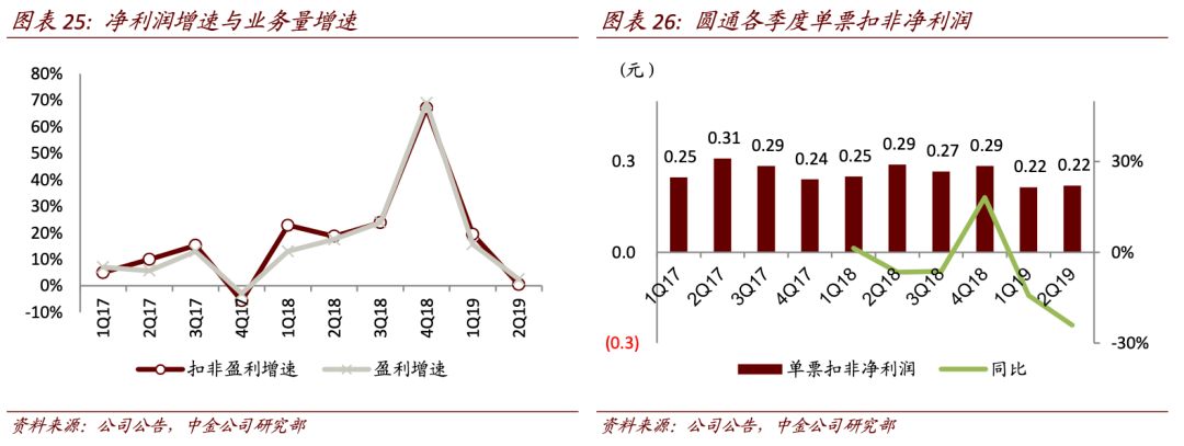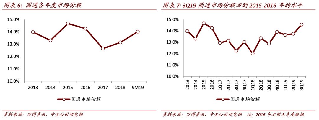 2019年,圆通则继续加速(二季度由于管理层更换出现内部政策调整不及时,增速短暂性放慢),尤其是3Q19增速达到44%,3Q19市场份额回到2015-2016年左右的水平。