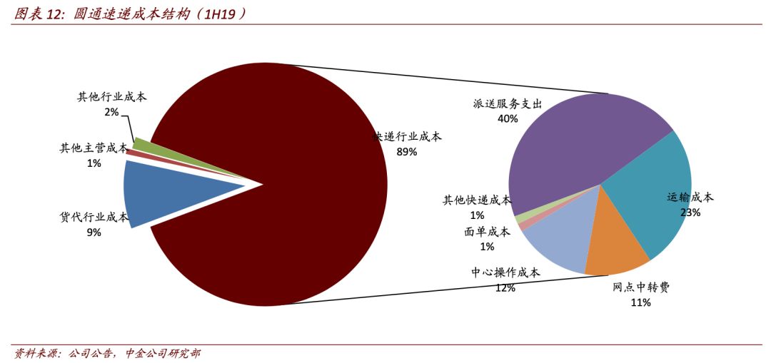 公司的成本结构主要为(1H19数据):快递行业成本(89%)、货代行业成本(9%,主要是圆通国际的货代业务)和其他主营成本(2%,主要是航空货运对外业务的成本)、其他业务成本(1%,主要是辅料、包装物销售等)。