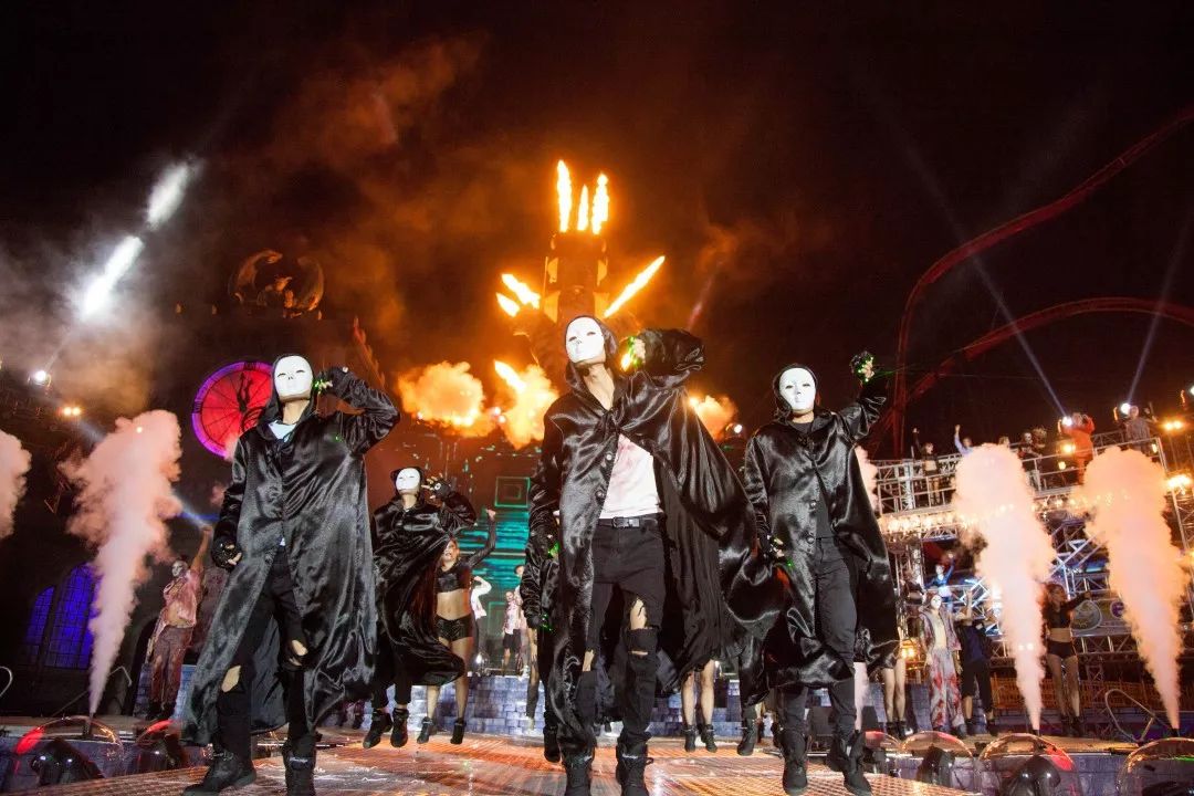 在演艺广场每晚会有一场精彩电音秀等着你!一起狂拽酷炫嗨翻全场大狂欢,鬼魅迷人的火焰魔女和千年冰封尸王率领一众大小鬼嗨爆全场!开心鬼马大巡游