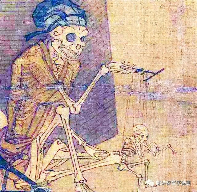 再看小骷髅上方,有一些细线吊着小骷髅的各个关节,顺着线往上是一个“王”字型线板,再往上看,更可怕的场面出现了,拿着这个线板的是一只手的白骨,白骨背后是一具头戴黑丝帽子,面目狰狞,席地而坐的大骷髅,阴森森的,很瘆人。尤其那一对眼洞显得格外惊悚。他一条腿平放在地上,另一条腿撑着那只拿线板的手,正在操控小骷髅。让小骷髅右脚着地,左脚抬起,两臂做招手状,还上下牙齿张开,似在说笑。这个画面也太诡异了。