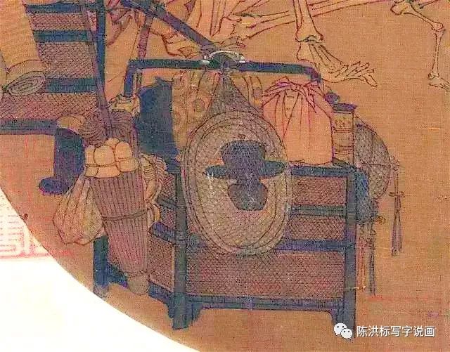 其次,整幅画看了让人很诡异,细思极恐。本来提线骷髅演出,是宋代市井中常见的一种木偶表演形式,只要了解它的历史,也没有什么可怕的。但是大骷髅身旁有一副担子,中间是一条扁担,两头挑着两个箱子,上面放着草席、雨伞等日常物品,这明明是街头艺人漂泊在外的家当。为什么画面上这个操纵小骷髅的不是街头艺人,而是一个大骷髅。