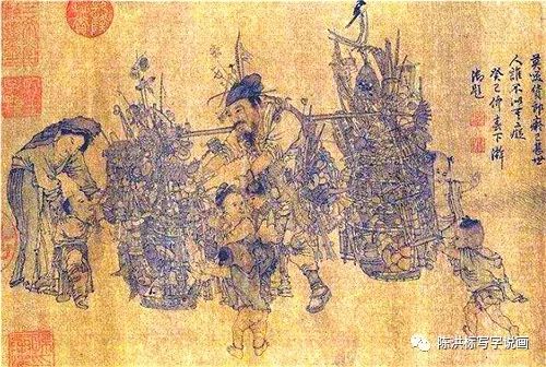 其中李嵩的《货郎图》是现存的一件有名的人物画作品,图中描写货担郎在乡村被孩童围住的情景,充满浓厚的乡土气息。就像20世纪九十年代初的义乌货担郎鸡毛换糖走天下的情景,最后闯出了闻名世界的中国小商品城。画面上充分描写了货郎担周围的孩童和妇女的精神动态,货郎担上琳琅满目的用品让孩童雀跃,让妇女们兴奋,场面很热闹。