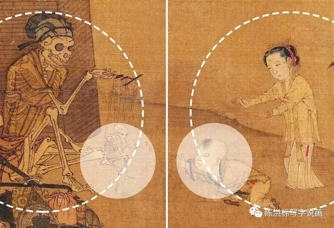 但是李嵩却要反着来,在一张A4纸差不多大小的扇面上,竟然画了6个人,画的还工笔。学过画的人肯定要在心里暗叫,我的天,他是怎么做到的?这不会是在惩罚自己吗?有人说这是画家在炫技,展现他绘画艺术的肌肉。想必,那是不自信的人所为,对于一代名家,他已没有这种必要了。但是他为什么要这么做?在这么小的扇面上画出的骷髅和薄纱,简直又是鬼斧神工。