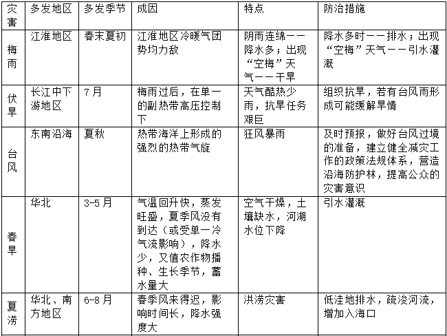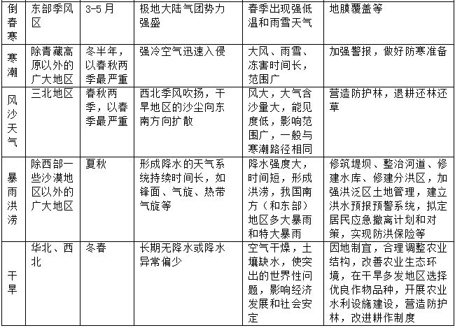 (4)多特殊灾害性天气。我国特殊天气有:寒潮、梅雨、台风、沙尘暴等。
