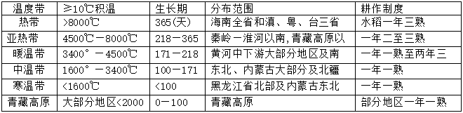 (3)温度带划分依据: ≥10℃积温。自北向南分别有:寒温带、中温带、暖温带、亚热带、热带。