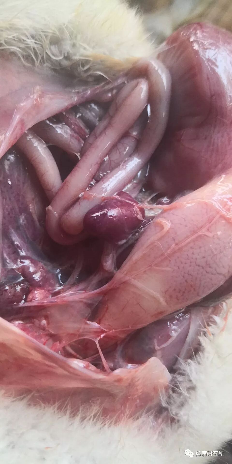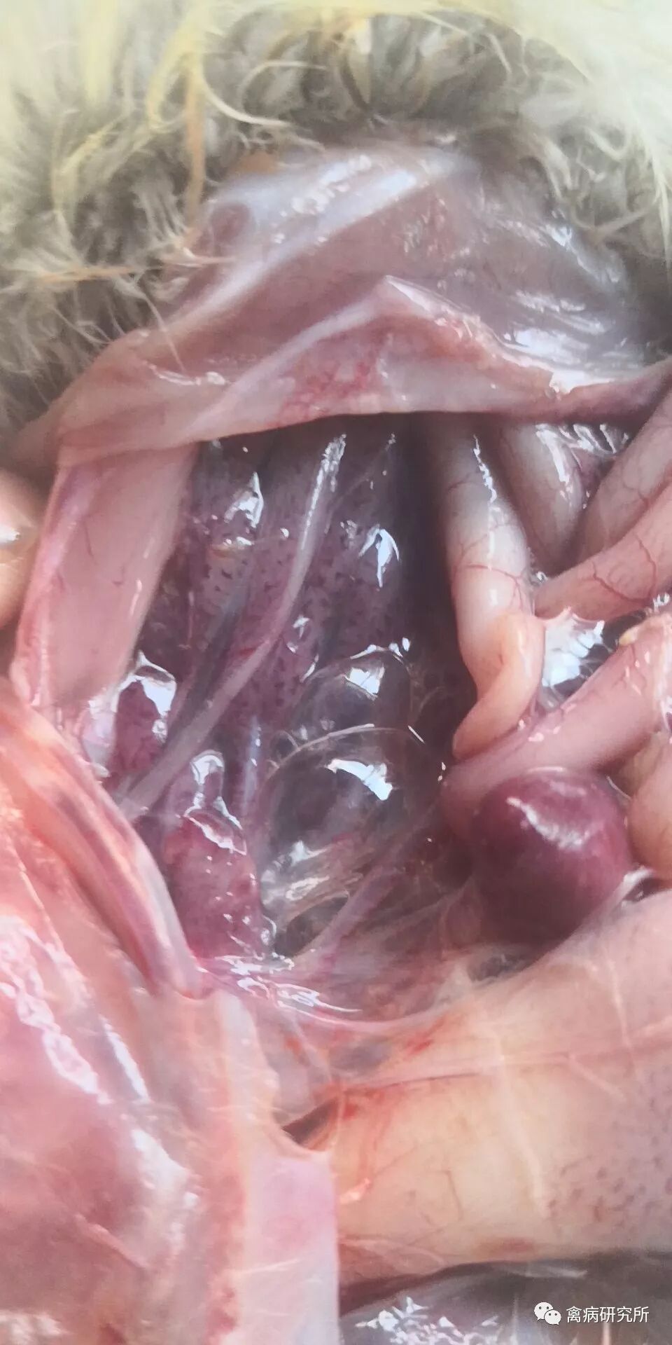 由鸭疫里默氏杆菌引起的浆膜炎,发病潜伏期一般为3-4天,临床症状表现为精神沉郁,缩颈,嗜睡,腿软行动缓慢、共济失调、食欲减退,不愿走动,嘴拱地。眼内有浆液或黏液性分泌物,眼周羽毛粘连脱落,鼻孔有分泌物,拉绿色或黄绿色稀粪便,部分有腹胀症状,个别有跗关节肿胀、跛行、卧地不起的症状,死前痉挛、摇头、抽搐、伸腿等状态。剖检病变有包心包肝,胆囊内充满胆汁,气囊浑浊、气囊壁增厚,表面有纤维素性渗出物,气管环出血,肺脏充血出血,有黄白色纤维蛋白渗出物,脾脏肿大淤血。怎样快速确诊浆膜炎?解剖鸭鹅时肝脏、气囊、心脏有灰白色和淡黄色纤维素样渗出,可以确诊为浆膜炎。