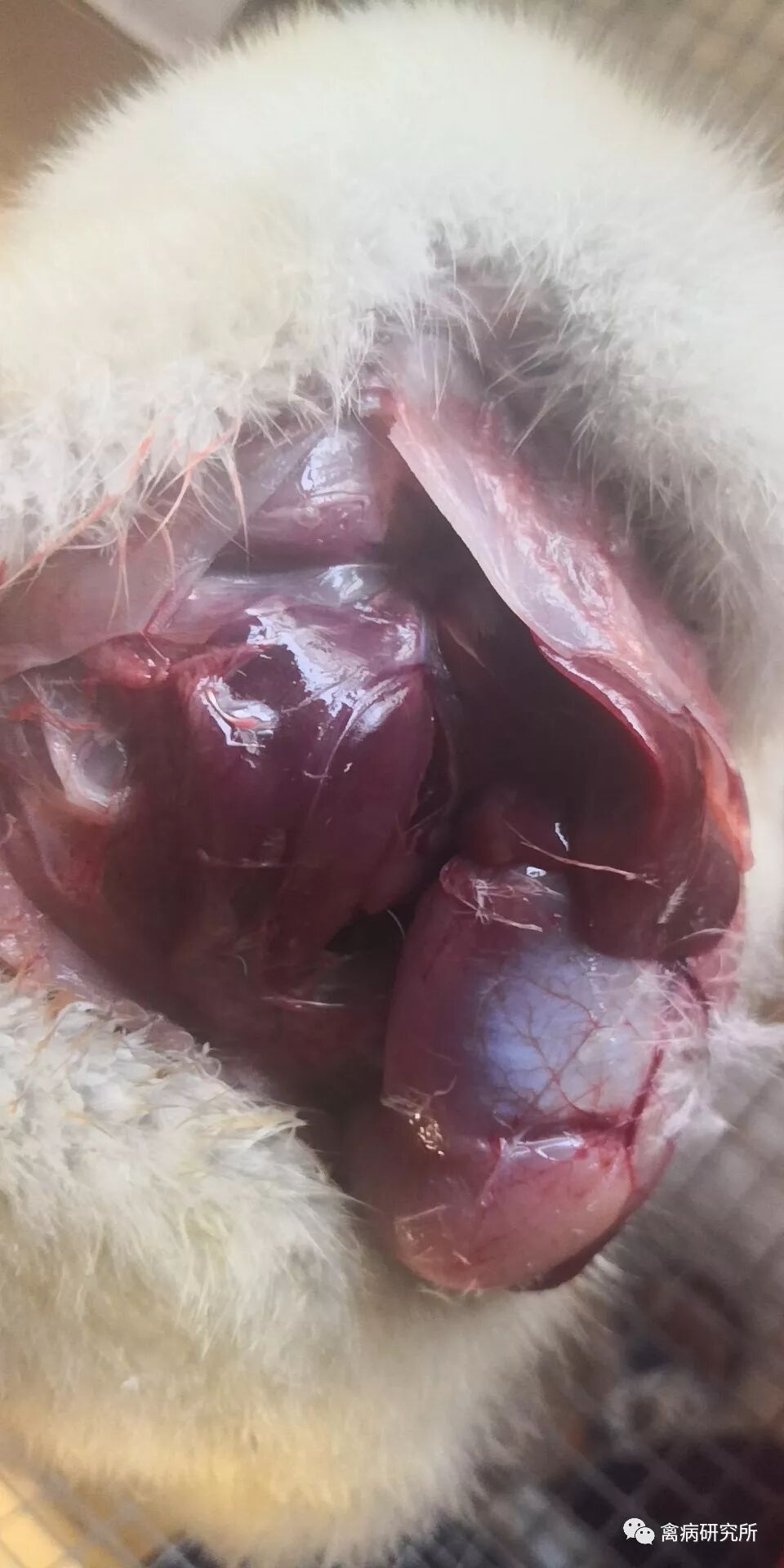 有趴着不动,站不稳,拉白痢;咳嗽,呼噜;解剖之后心冠脂肪充血肿大,包心包肝,气囊有泡沫样附着物,肾肿