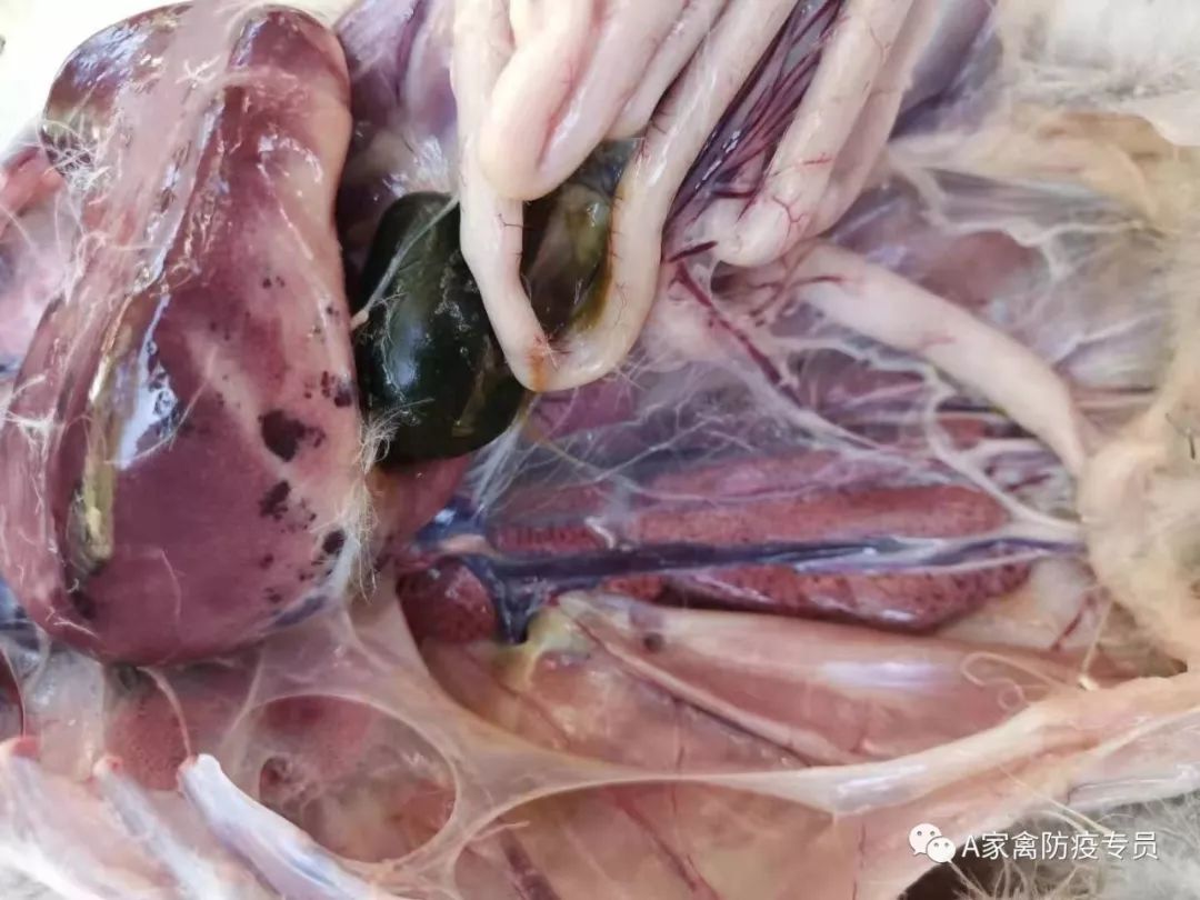 剖检病变为心脏心包积液,心包膜有纤维素性渗出物,肝脏表面有灰白色或灰黄色纤维样渗出物,肝脏肿大脆弱,呈土黄色,脾脏有白色坏死点。