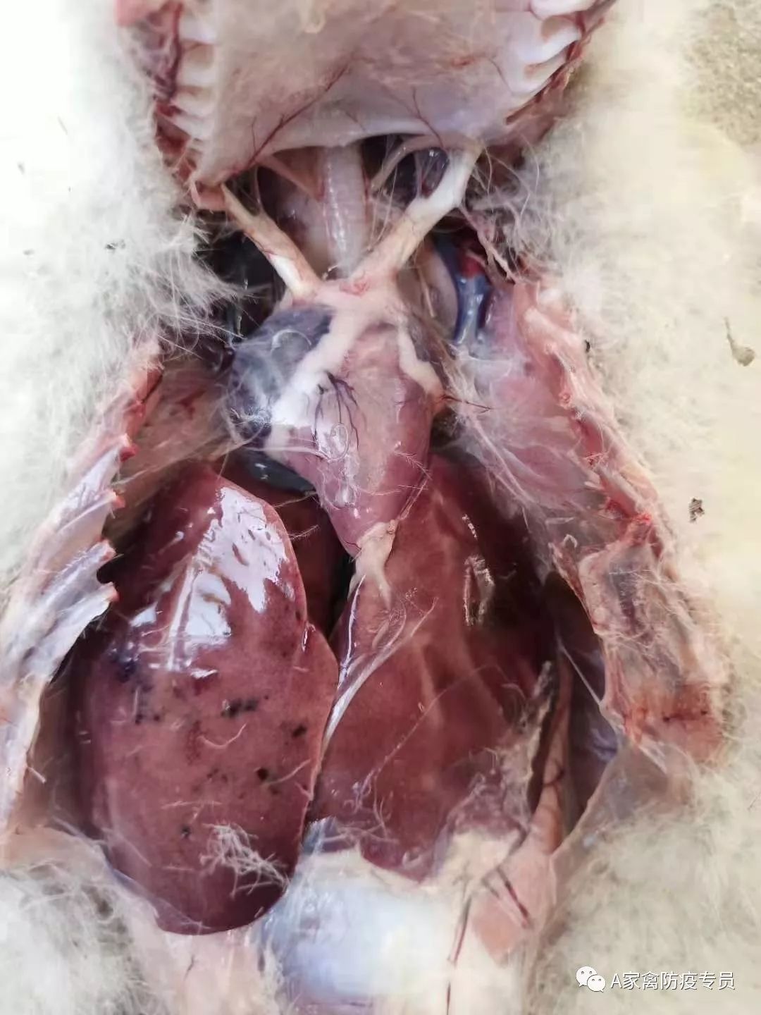 有趴着不动,站不稳,拉白痢;咳嗽,呼噜;解剖之后心冠脂肪充血肿大,包心包肝,气囊有泡沫样附着物,肾肿,肝上有黑色斑点坏死。