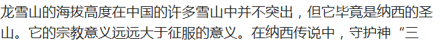 多”化身为玉龙雪山,保护着一代又一代的土地,保护纳西族的繁衍生生世世。玉龙雪山是纳西族神的化身,不应亵渎或践踏。这是不允许的。这是他们的圣山,是信仰的统一。凡踏进这座禁山的人都将受到上帝的惩罚。
