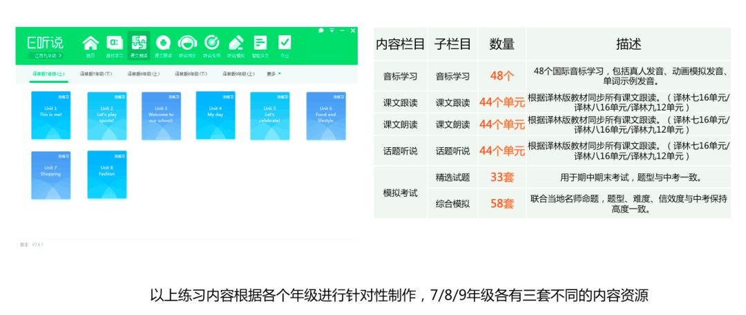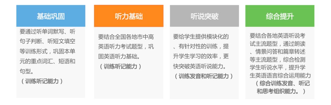 所有训练内容,均可在E听说手机APP上进行人机对话训练,学生练习完即可实现智能评分。各个单元的内容由浅入深,循序渐进,以综合训练学生的听说技能。