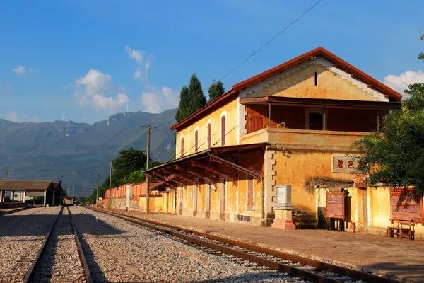 红河还有一个碧色寨车站,《芳华》取景地之一。陈旧的站台和斑驳的候车室,一排排红窗户的橙黄色房屋在蓝天下整齐的排列着。