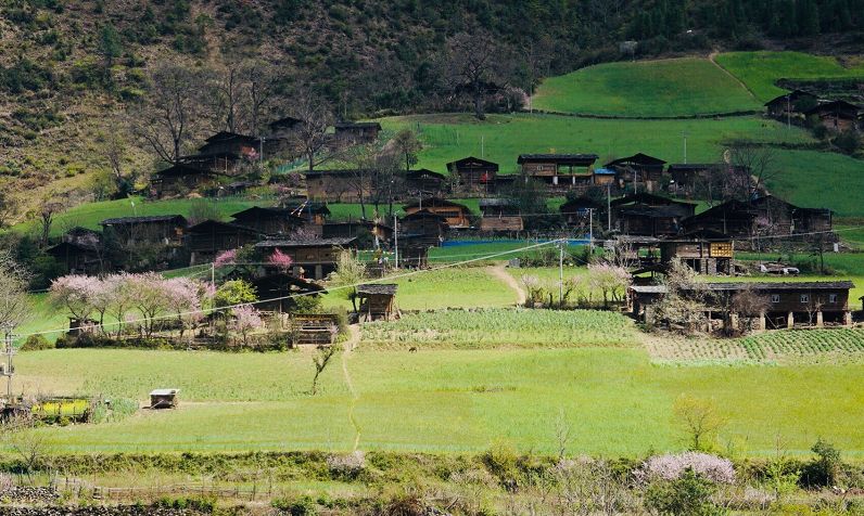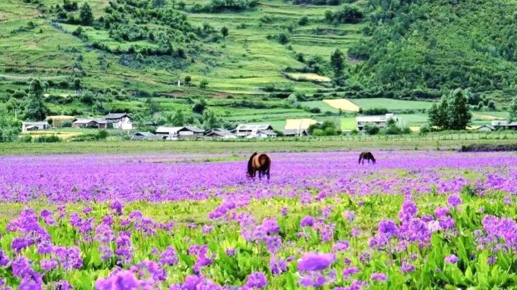 位于玉龙雪山西部丛岭中的文海村,纳西人用木头建造房屋,屋顶上铺的是灰色的瓦片,漫山遍野开满了色彩鲜艳的花,团团花簇点缀在山野间。