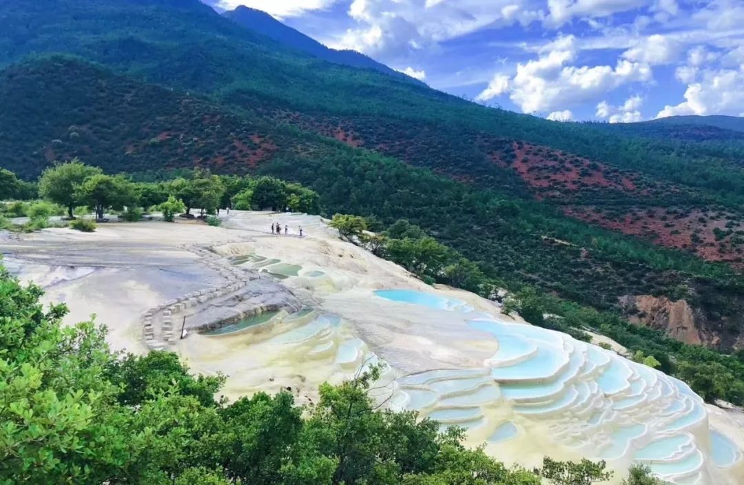 香格里拉真好看。中国版土耳其棉花堡—白水台,潺潺圣洁,波光粼粼。 含碳酸氢钙的泉水慢慢下流沉淀,长年累月形成台幔,好似层层梯田,被称为“仙人遗田”。