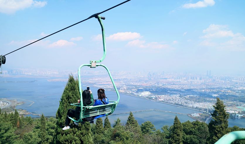 昆明真悠闲。乘坐西山缆车,远处的春城之都,伫立在一望无际的滇池波光之上,被碧水蓝天环抱在其中。