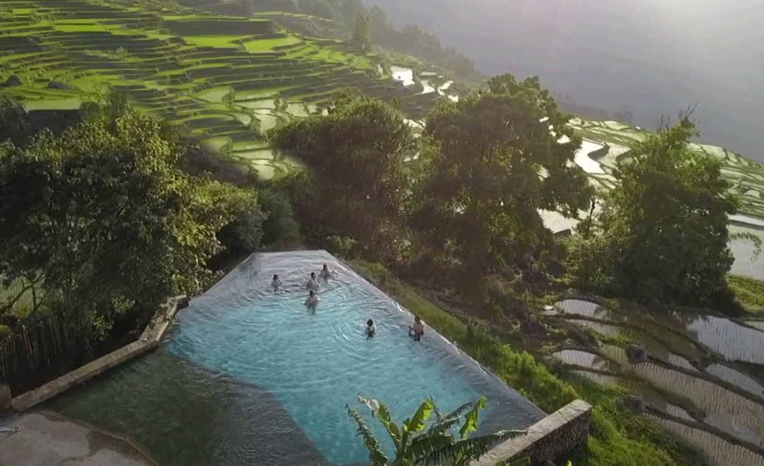 帐篷营地里还有一个无边泳池,与周边梯田完美融为一体。走出帐篷,视野辽阔,梯田美景一览无余。