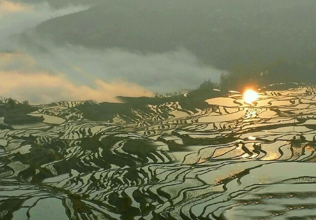 日出前,哈尼梯田优美的轮廓在黎明的晨曦中逐渐清晰,站在高处俯瞰下去,宛若一幅极其清新的风景画。