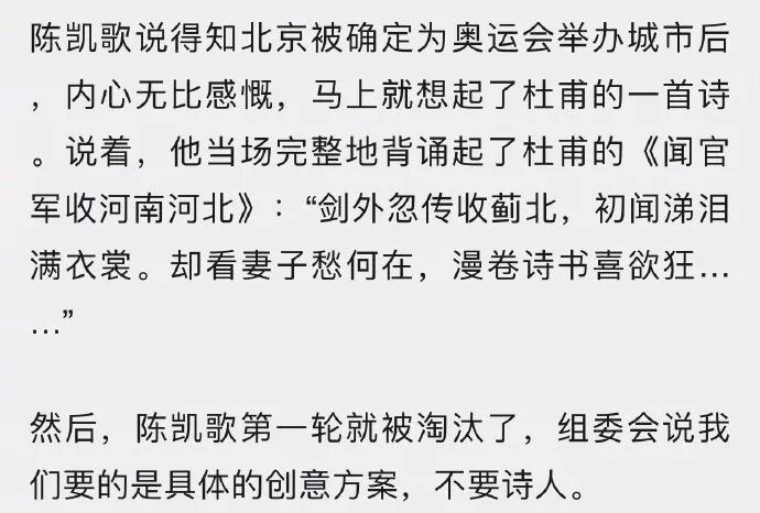 原来陈凯歌当年也竞争过奥运会总导演,上去当场念了一首杜甫的诗,然后就被淘汰了。组委会说我们要具体的创意方案,不要诗人