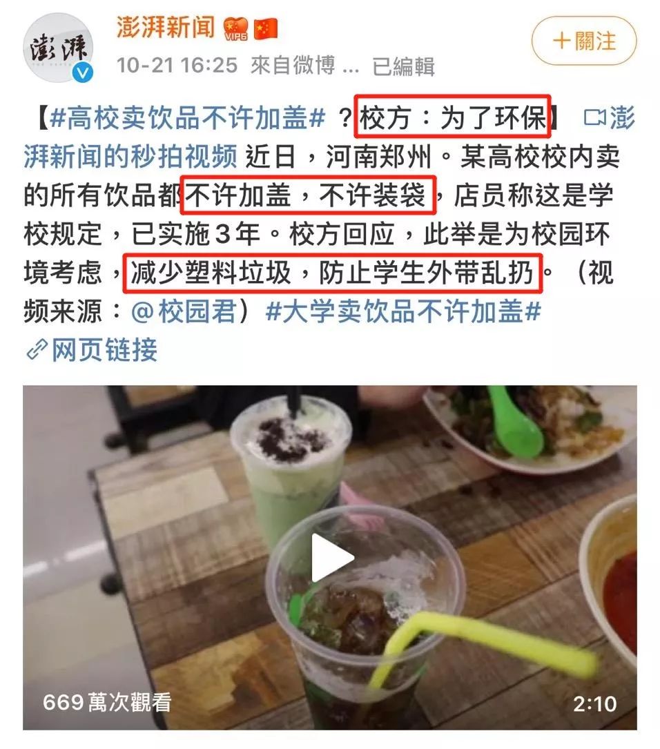 该学校规定卖的所有饮品都不许加盖,不许装袋且已实施三年