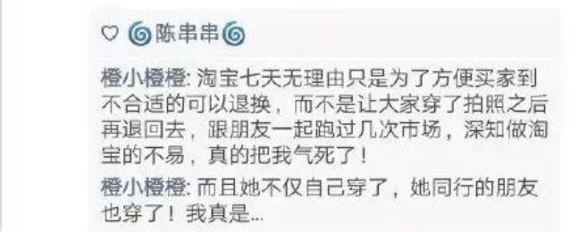 再说了,姑娘你考虑过你穿了好几天的衣服,然后退货后,被其他买家买走时,她的感受吗?