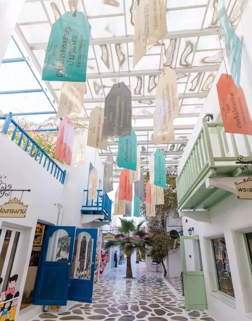 作为泰国的“小希腊”,整座园区的建筑风格完全模仿希腊爱琴海上的小岛圣托里尼,蓝窗白墙的小房子内,是一家家精品小店,漫步其间,犹如置身圣托里尼小岛上,浪漫又惬意。