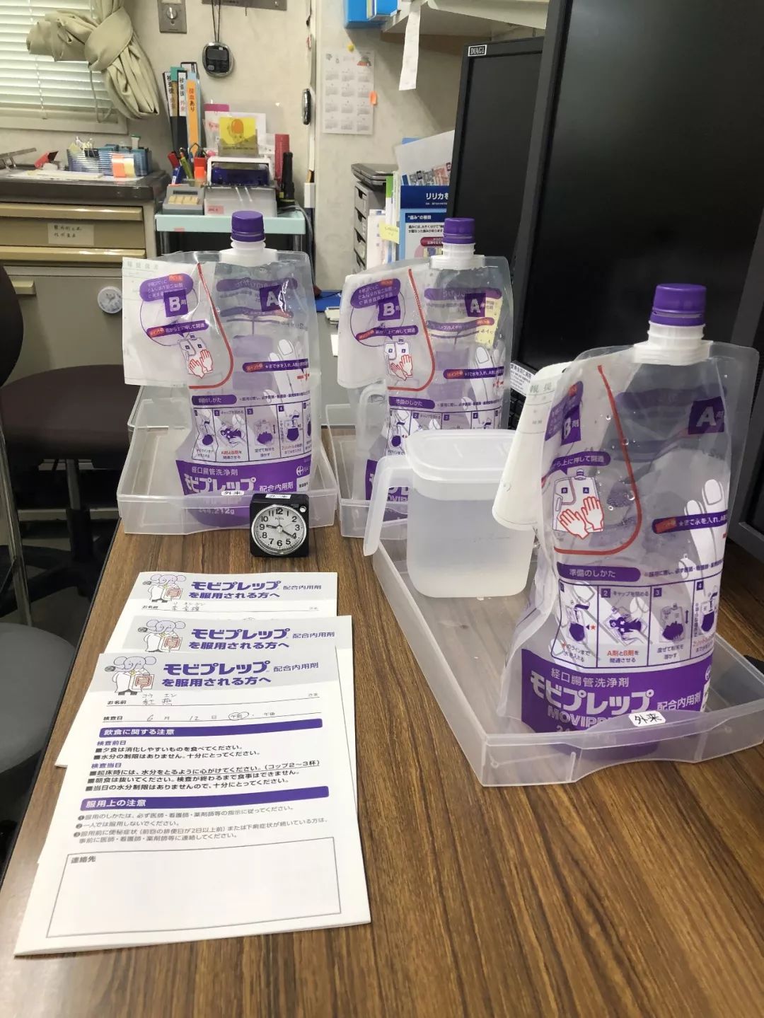 老王比较瘦,年轻的时候就很瘦,至今快40岁左右仍旧未发福,平时胃口也不太好,在国内时,曾建议他做胃镜,但是一听到胃镜就翻山倒海,就这样不了了之。这次检查安排了胃镜和肠镜,医院提前给了检查替代食物和清肠水,既保证了营养又不影响第二天检查,清肠水满满1.5升,我尝了几口味道有点像酸梅汤。