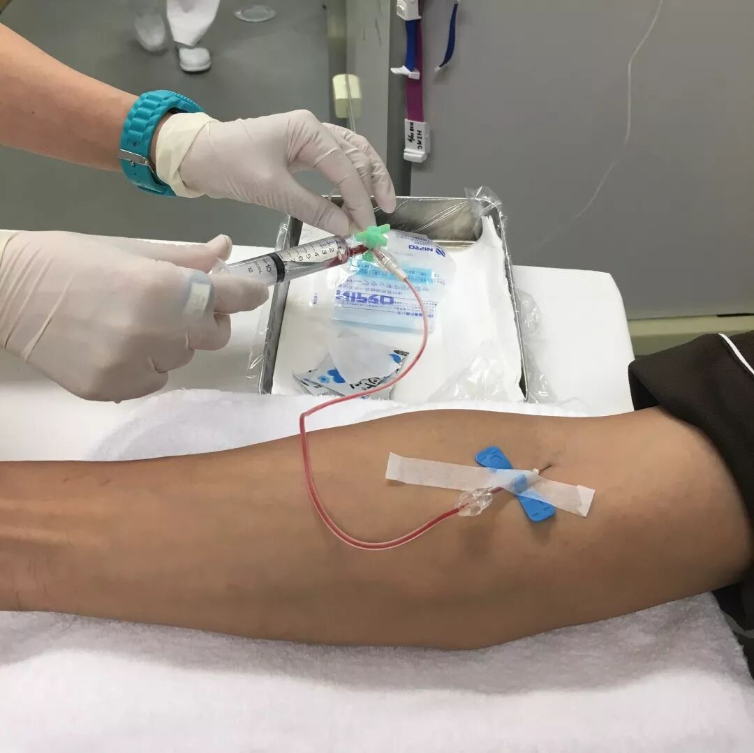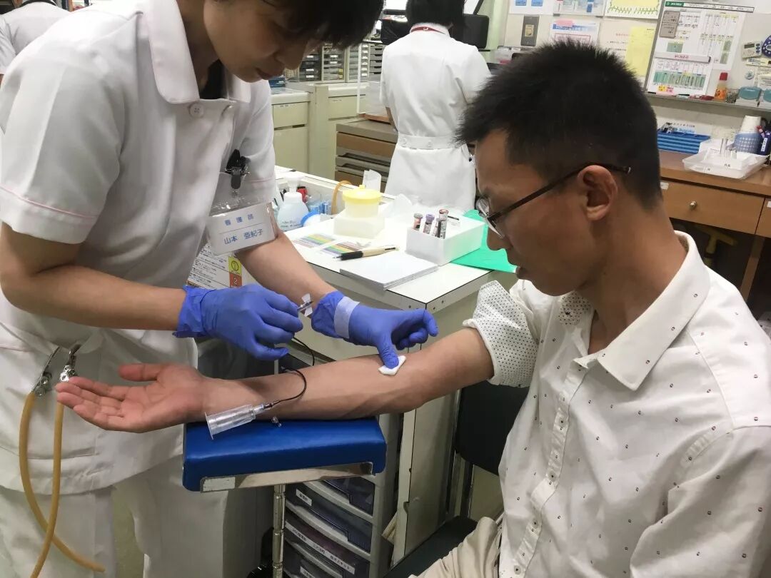 美希堂工作人员先带老王量了身高体重以及血压,接着是验血,护士长手法很温柔熟练,跟我们说感谢对医院的照顾。