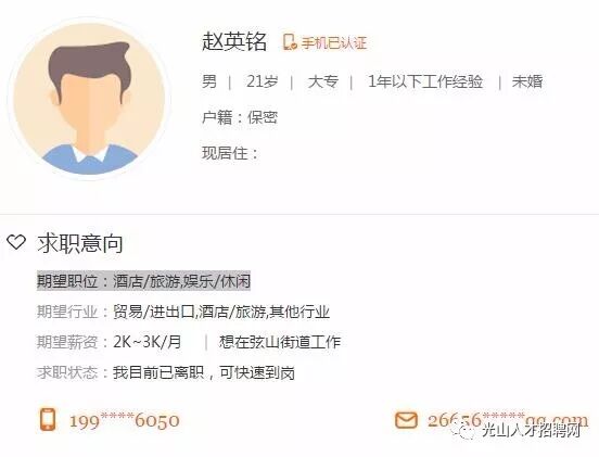 光山人才网丨赵先生找工作!期望职位:酒店/旅游,娱乐/休闲(10月26日)