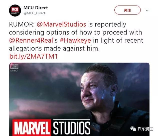 诚然,关于雷纳的指控,也是他和前妻为夺取女儿监护权的一单方面。在这些消息传出往后,就有传言说,漫威及其母公司迪士尼正在考虑将MCU里的鹰眼换掉,少少漫威粉丝对此表示支持。在推特上,有所谓消息人士发推说,漫威正在考虑换掉杰瑞米·雷纳,大约减少他的出镜次数,甚至完全把他从电视剧《鹰眼》中免职。少少知名媒体人,如DanielRichtman和GraceRandolph也转发了此消息。