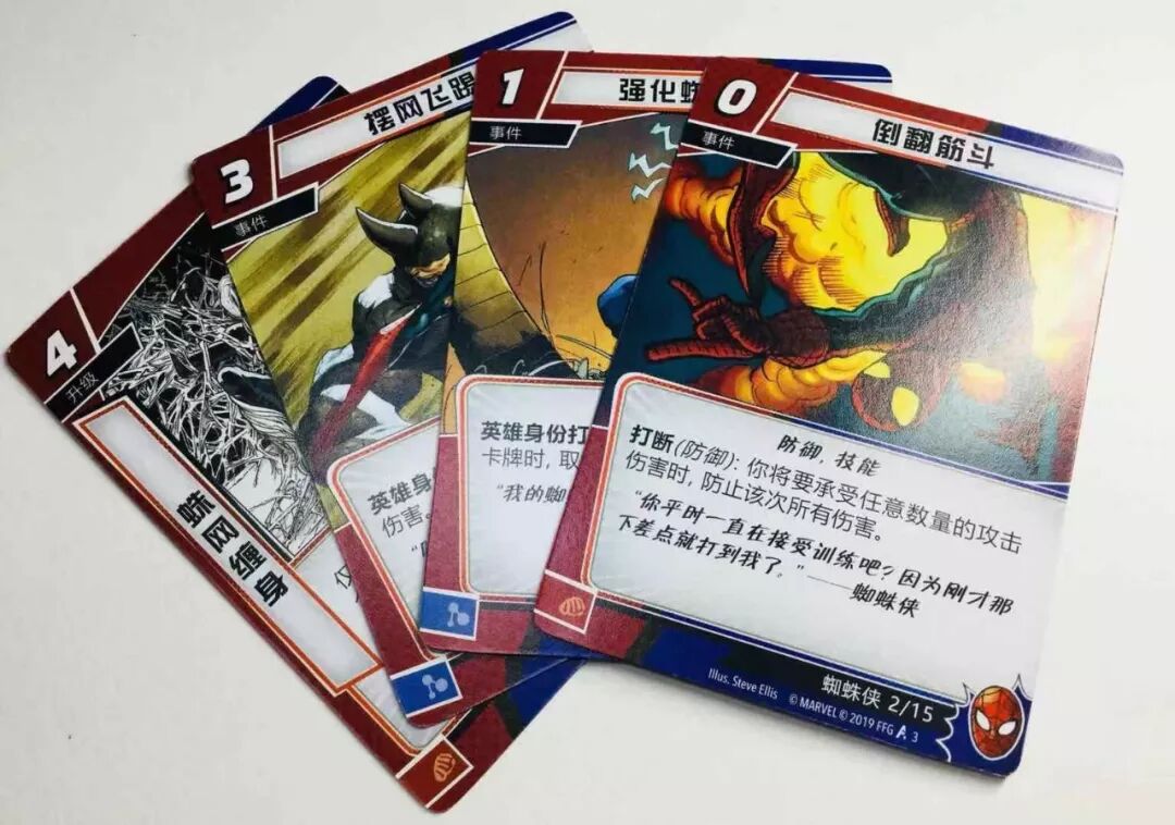 为什么超级英雄们能拥有如此大的吸引力,明明是虚构的人物却让人觉得他们就在我们的世界中生活?这就是通过电影、漫画、动画历时数十年打造出的每个超级英雄的个人故事,他们的喜怒哀乐悲欢离合创造了出一个个只属于这些超级英雄自己的剧情世界,让作为观众和读者的我们慢慢建立起一个完整的人物形象。所以,为了保持这种超级英雄有自己剧情的感觉《漫威群英传》的办法是为每个英雄角色设计了一套专属英雄卡牌。小蜘蛛的起始套牌中他的专属英雄卡牌就包括: