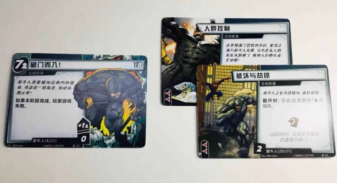 最重要的则是密谋卡牌 这是反派们要完成的阴谋诡计,当密谋推进到一定程度反派就会直接获胜,而这些密谋则如同一个个微型模组一样,在一定程度上决定着英雄们必须面对的局面。