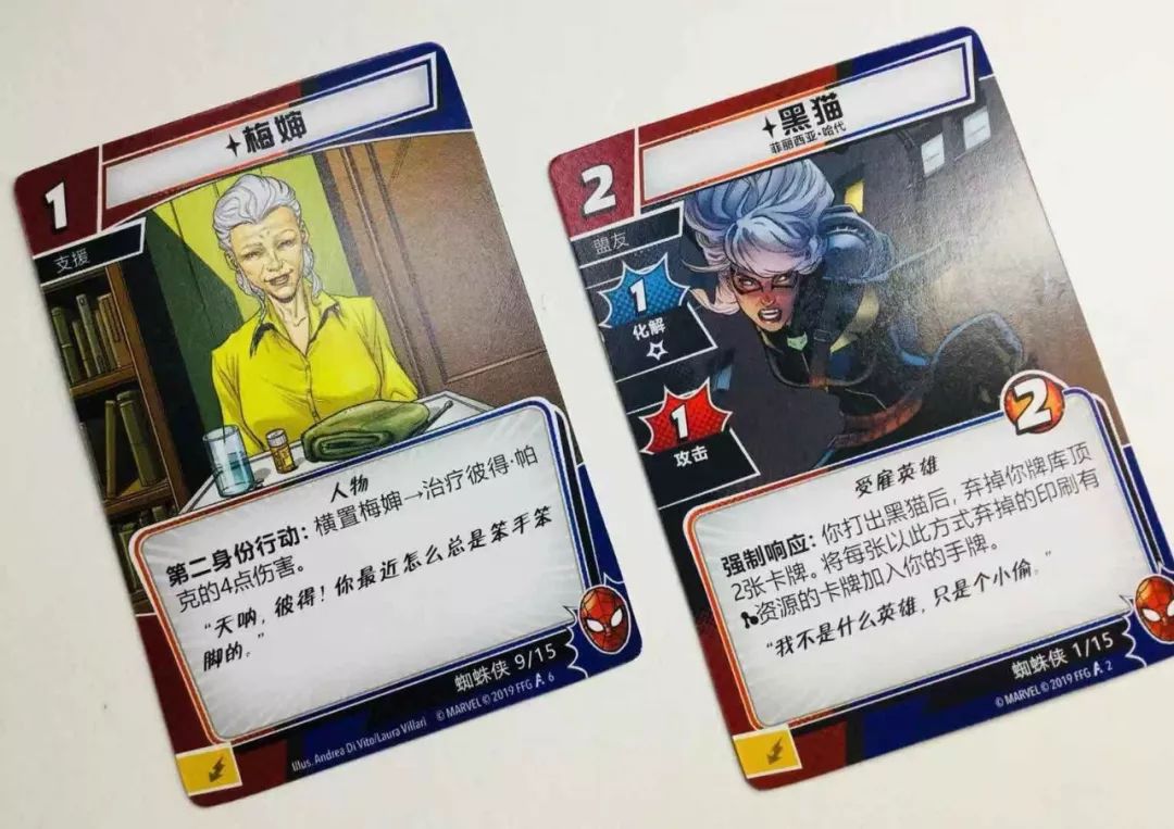 梅婶 & 黑猫 —— 这两位都是和 小蜘蛛 关系重要的人物,而且有趣的是明显没有战斗力的梅婶 的治疗能力只有 第二形态 才能启动,这也很符合剧情中 梅婶 在 彼得·帕克 的人生中对他细心呵护的长辈形象。至于 黑猫 则是以可以协助蜘蛛侠战斗的盟友卡牌登场,能在战斗中助他一臂之力。